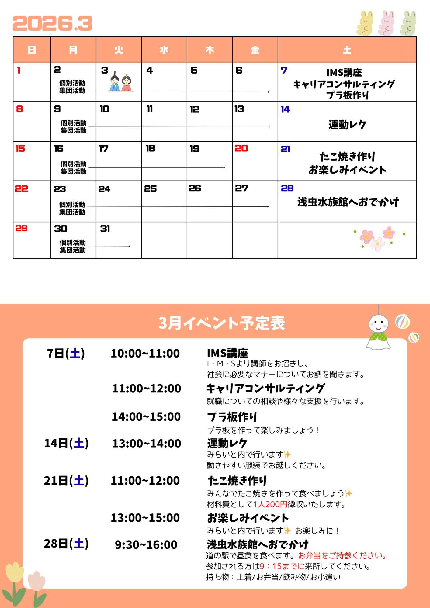 季節ごとのイベントや地域の催し物への参加、スポーツ体験等を行っております。その他、子どもたちの自立につながるようなイベントを月ごとに予定しております。天候や感染症等の影響により変更となる場合がございます。